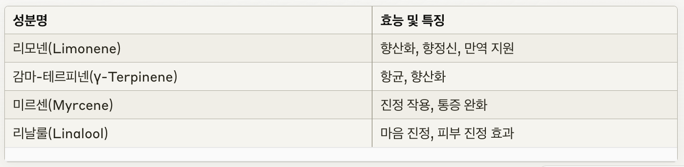 이 성분들이 우리 몸과 마음에 긍정적인 영향을 주는 핵심 비밀이에요. 특히 리모넨은 기분을 좋게 하고 몸을 건강하게 유지하는 데 탁월하답니다.