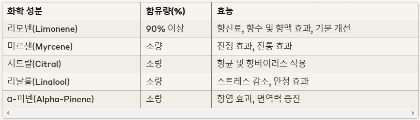 자몽 에센셜 오일의 효능은 그 안에 담긴 특별한 화학 성분 덕분이에요. 주요 성분을 표로 정리해 보았어요.